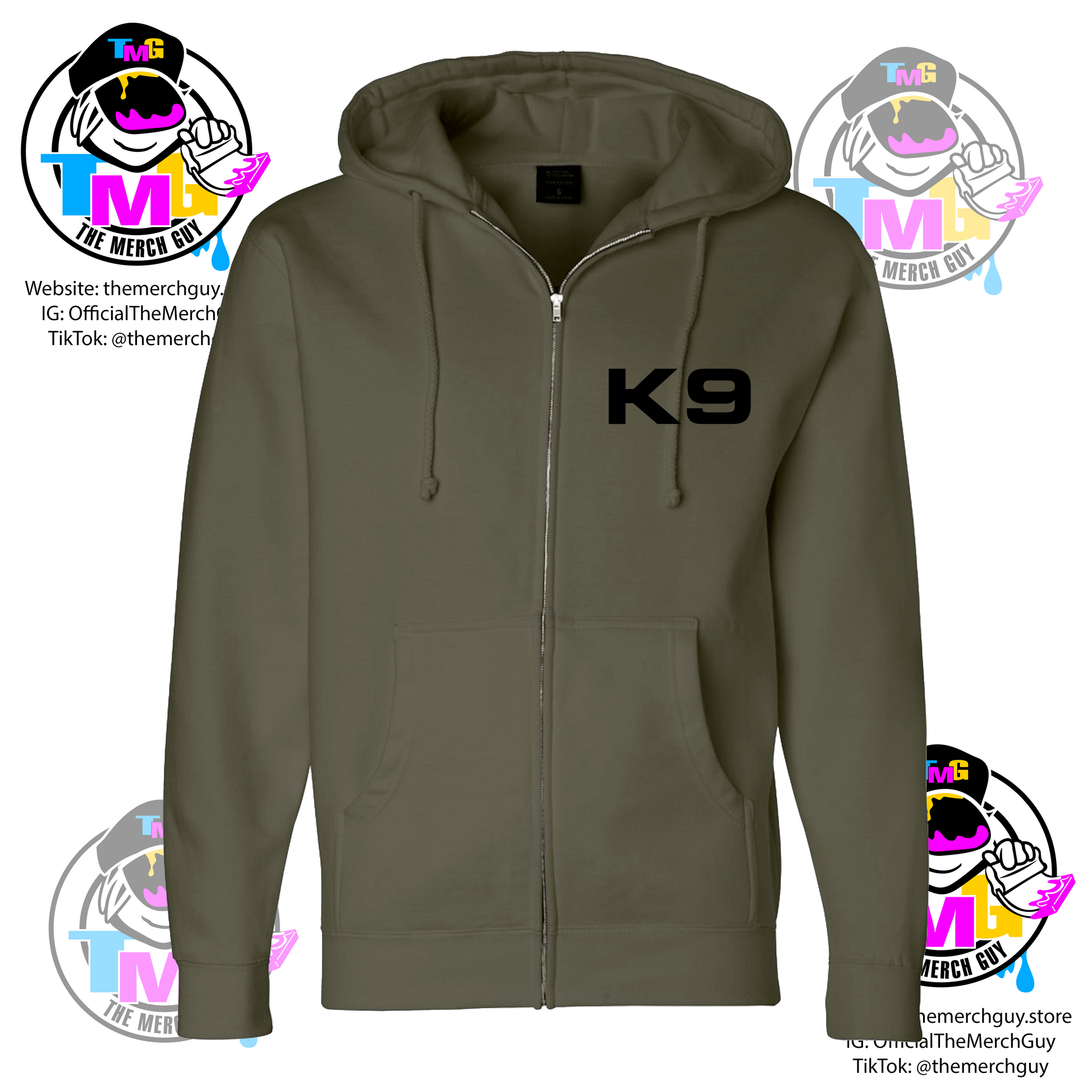 This item is screen printed K9 zipped hoodie with a dog head on the back and K9 on the front.