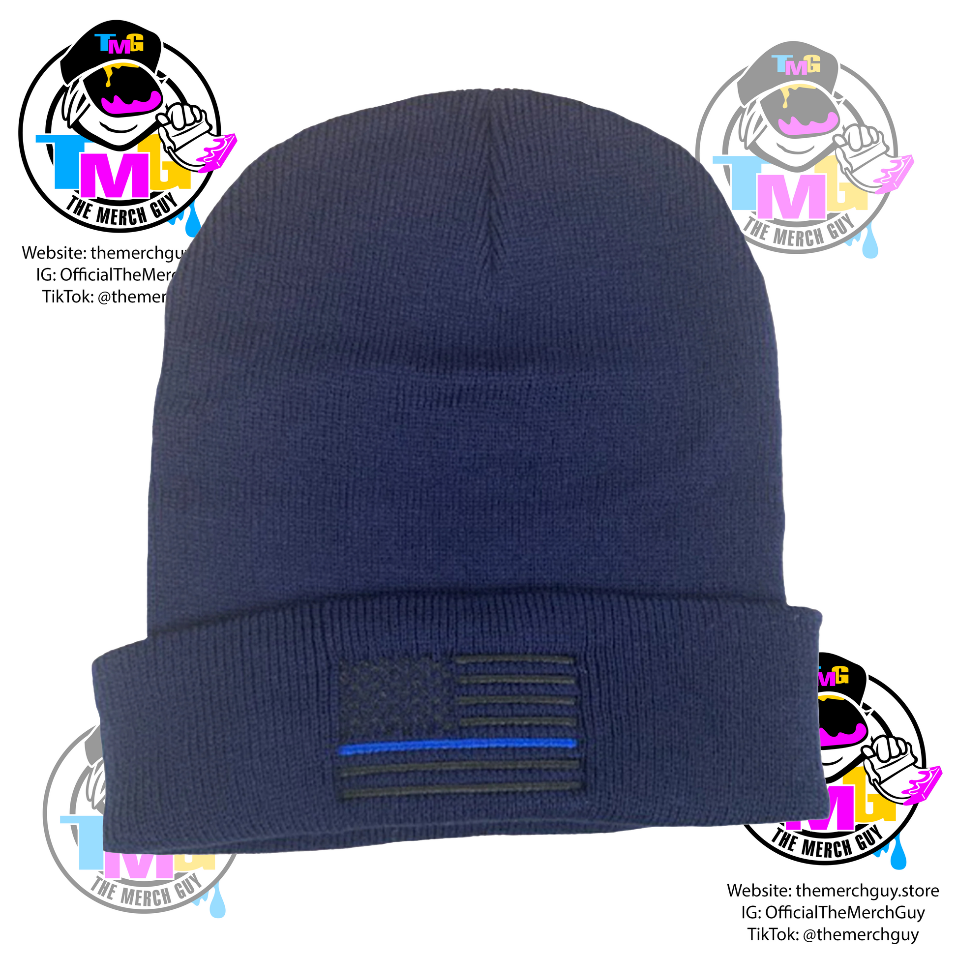 USA Flag Blue Line Embroidered Beanie - Police Beanie, Blue Line Beanie